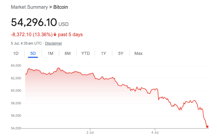 The price of Bitcoin has fallen more than 13% over the last five days to lows not seen since February of under $55,000.