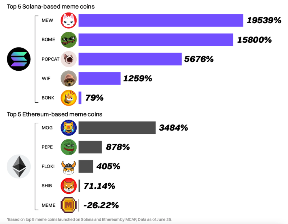 Data from CoinMarketCap (CMC) shows that Solana-based memecoins outperformed Ethereum-based memecoins by almost 8x this year. Solana's $MEW has grown 19,539% compared to Ethereum's $MOG, which topped out at 3484%.