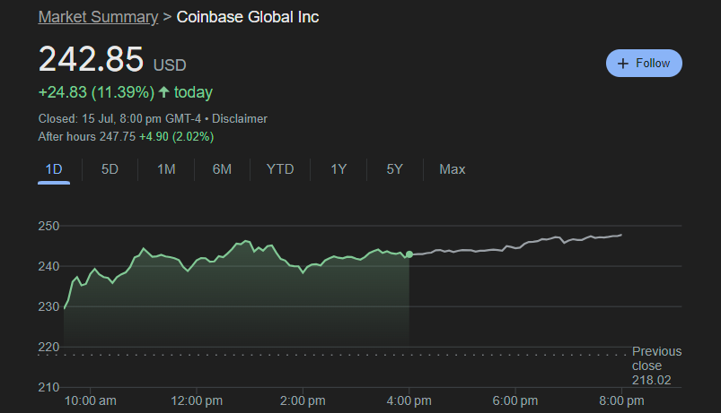 Meanwhile, Coinbase's stock price soared more than 11% in trading yesterday.