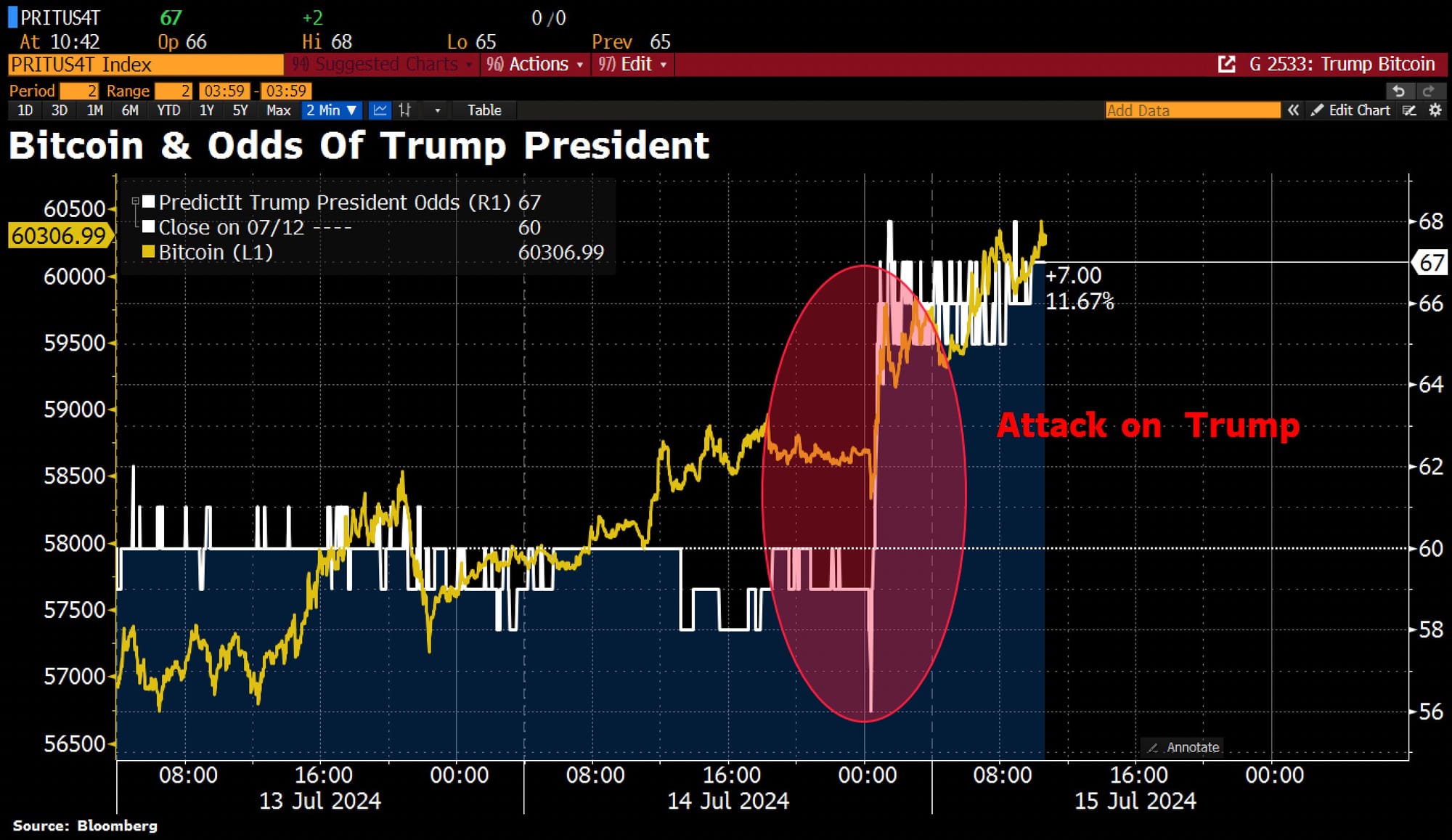 The market seems to have spoken. The crypto market is bullish Donald Trump. After his assassination attempt last weekend, the former President saw his approval rating jump to 67% on Predictit.