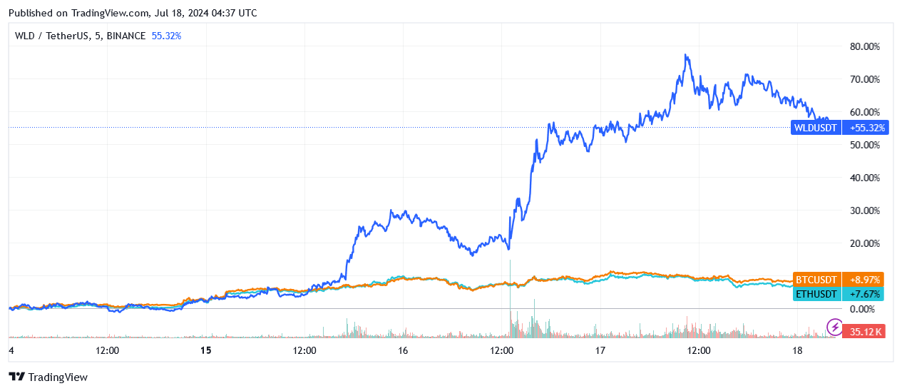 Worldcoin (WLD) is up 55% in the past 5 days. In comparison, BTC and ETH is up only 8.97% and 7.67% respectively. Trading volume also picked up significantly compared to average trading days.