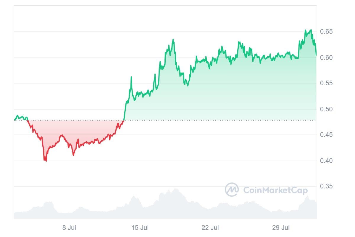 The token climbed by 8% on Wednesday, reaching a price of $0.6586 but fell to $0.6045 currently, though it is still close to 30% up from its price just a month ago.