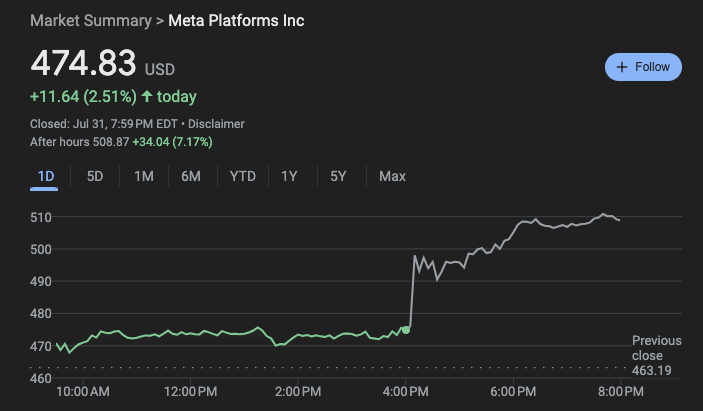 In yet another familiar tale, Meta's nonetheless stock price surged in after-hours trading more than 7%, taking it over the $500 mark, due to the company's overall earnings beat.