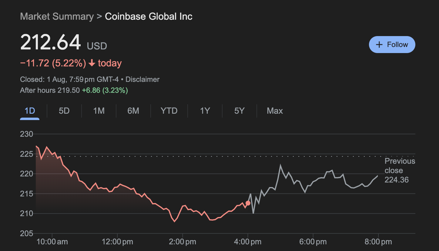 In after-hours trading, Coinbase's stock price rose 3.2% following the release of its earnings report.