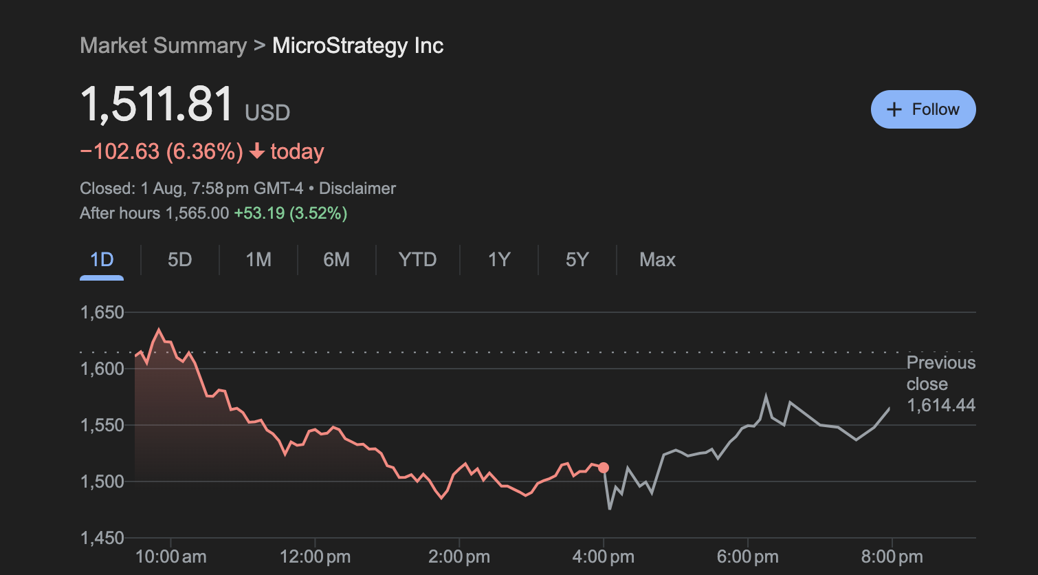 Despite reporting a loss, Microstrategy's stock price is up over 3% in after-hours trading.