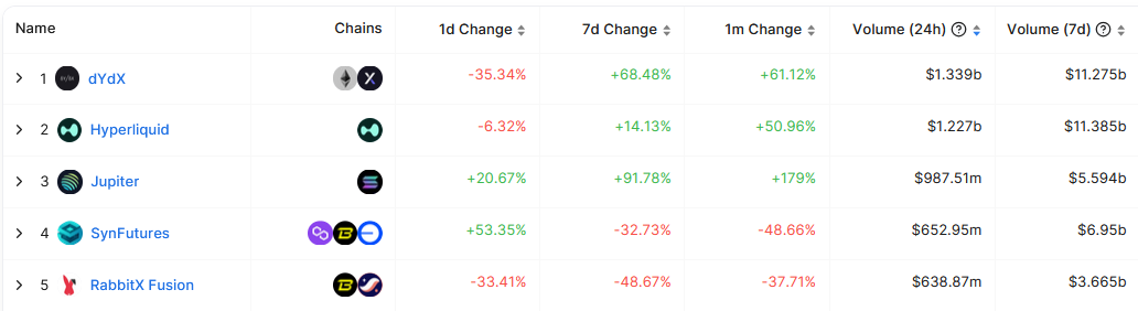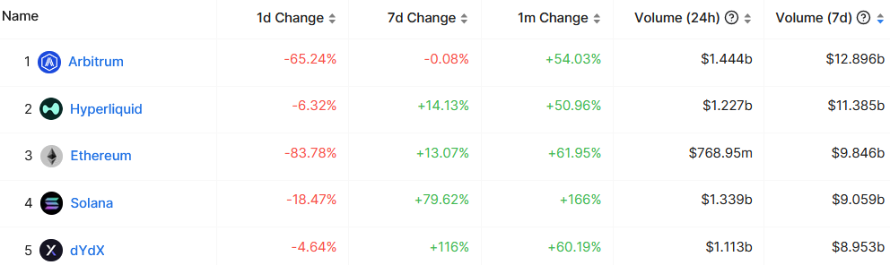 As a standalone chain, Hyperliquid ranks behind Arbitrium in 7-day Volume. Compared on an individual project level, Hyperliquid ranks just behind dydx in terms of volume which is impressive considering that they did not raise any outside capital. According to their docs, Hyperliquid Labs is self-funded and has not taken any external capital, which allows them to focus on building a product without external pressure.
