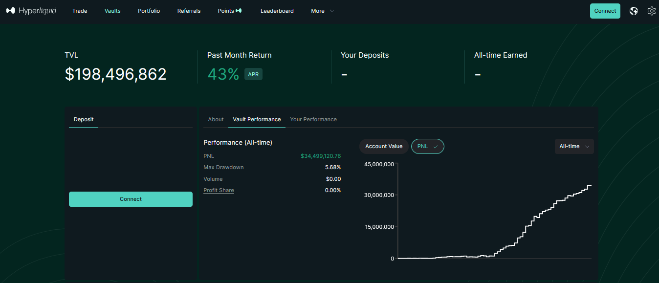 There is also the Hyperliquidity Provider (HLP) vault, which is a protocol vault that acts as a market maker and executions liquidations, receiving a portion of trading fees where users can deposit USDC and share in the profit and loss.