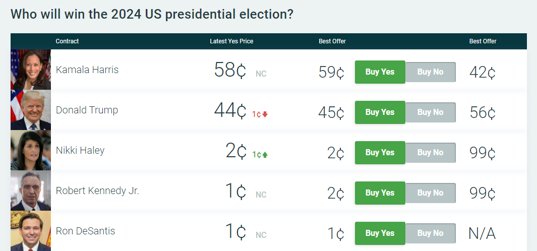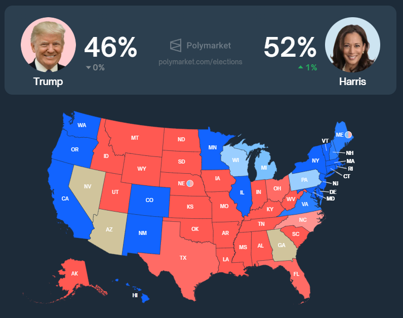 Polymarket polls now have Harris at a 52% lead against Trump's 46%, while crypto betting site Predictit is selling Harris "yes" votes for 58c compared to Trump's 44c.