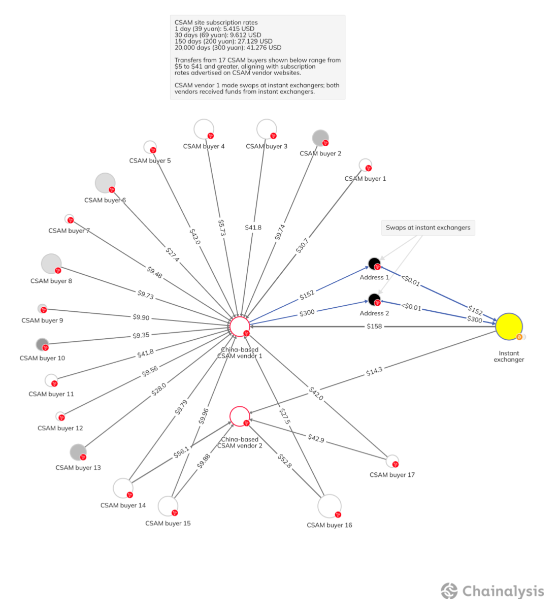 The amount transferred to vendors from buyers' wallets also signals the type of material they are buying. Buyers can get access to CSAM material for as low as $5 and given that distribution is free on the Internet, this creates a long-term vicious cycle of exploiting children. These vendors are off-ramping using instant exchanges which is another type of non-custodial exchange.