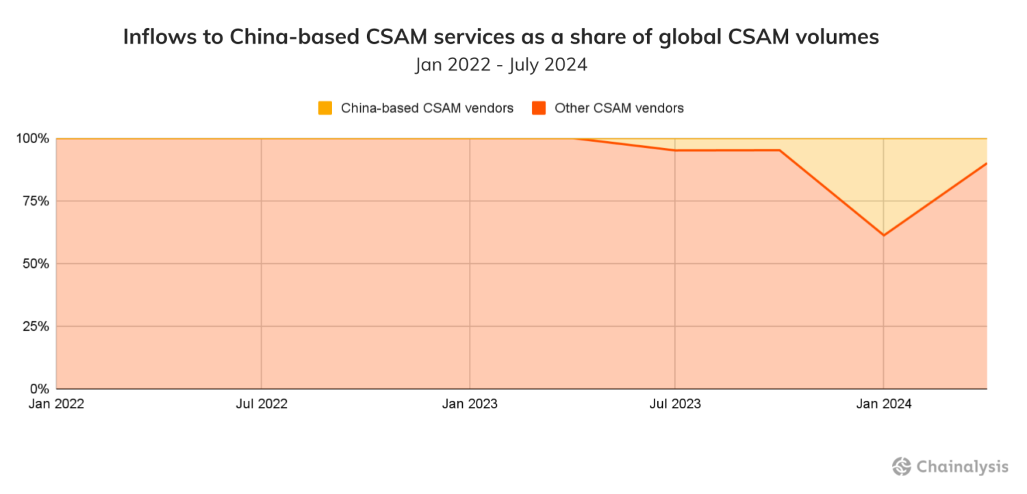 From the end of 2023 untill now, vendors based in China have accounted for a larger share of global CSAM inflows, with its market share reaching as high as 38.8% of total inflow. “We are seeing an increase in the reporting of these types of sites,” says a spokesperson at the Internet Watch Foundation (IWF), an organization focused on combating CSAM online.