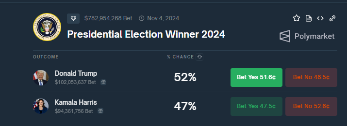 Former President Trump now has a 52% chance of securing the win in November while Harris's odds have slipped to 47%.