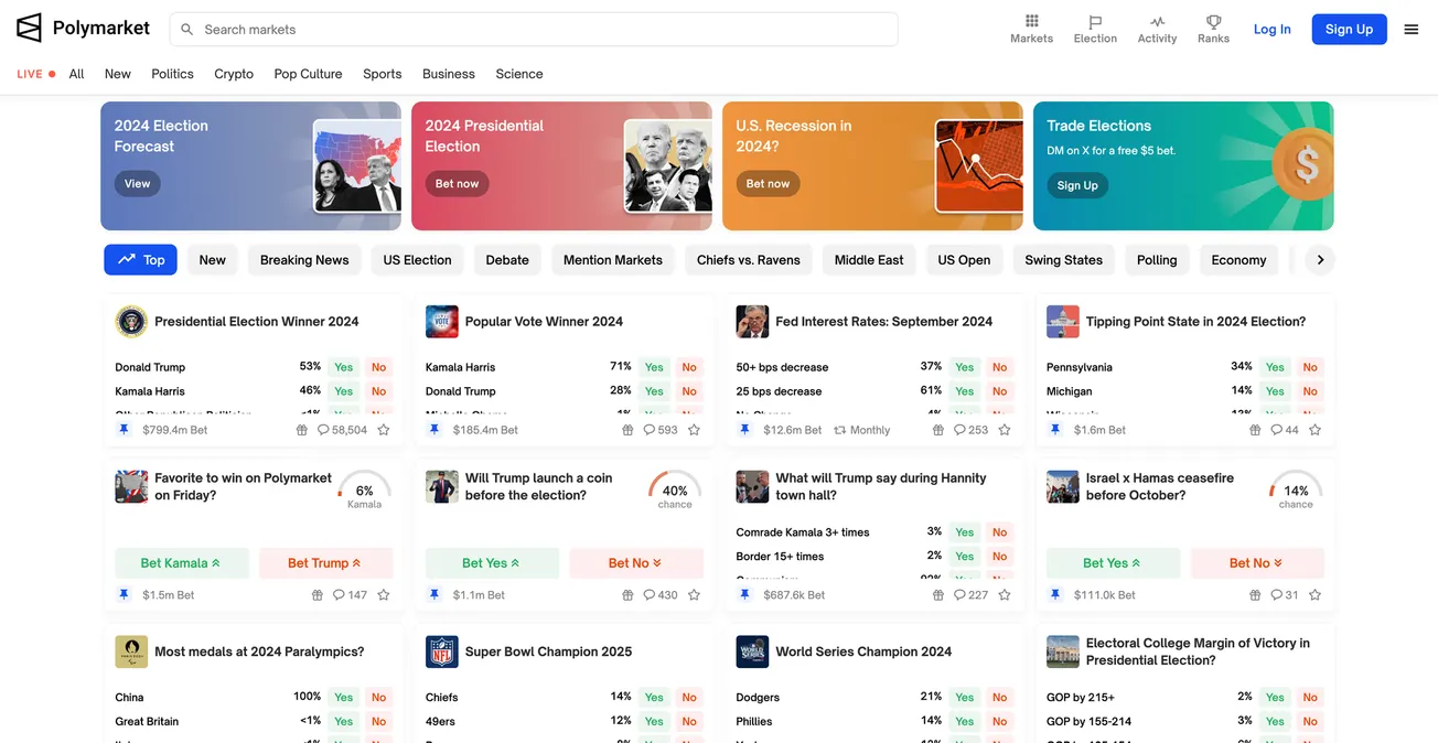 Current Polymarket data reveals a tight race for the 2024 US presidential election. Traders are placing a 53% probability on Donald Trump winning the election, with Trump slightly ahead of Kamala Harris, who is projected at 46%.