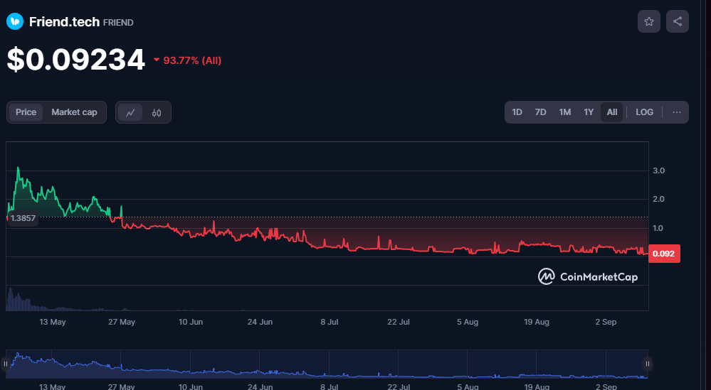 Friend.tech’s invite-only beta launched on 10 August, racking up 4,400 ETH in trading volume on the first day. Generating $2.88 million in protocol fees, it was once the third-largest cryptocurrency protocol by market cap.