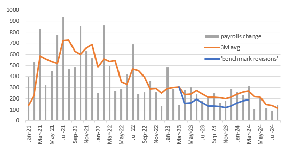 The data has been revised downwards regularly recently, and that doesn't even account for the changes made to the provisional benchmark a few weeks ago, which revealed that the BLS underestimated payroll increases by an average of 78,000 each month in the twelve months leading up to March 2024.