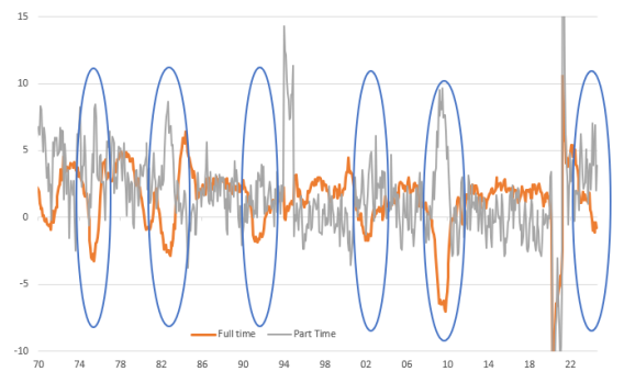 There is a clear disparity between full-time and part-time employment. This supports the theory that the United States is gaining mostly lower-paying part-time jobs while losing full-time, well-paying jobs mostly due to attrition rather than replacing employees who resign or retire.