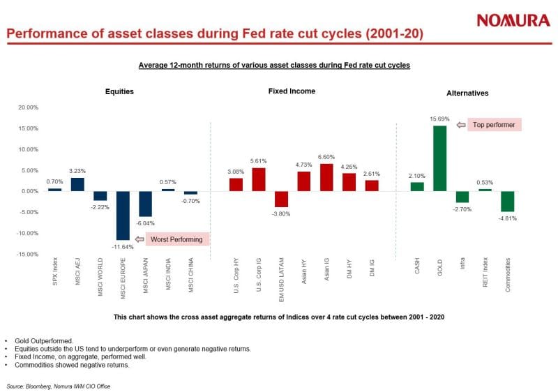 Nomura's chart below shows the performance of asset classes based on aggregate returns of indices during previous Fed rate cut cycles (2001-20). Alternatives, led by gold, have been the top performers, while equities have fared the worst.