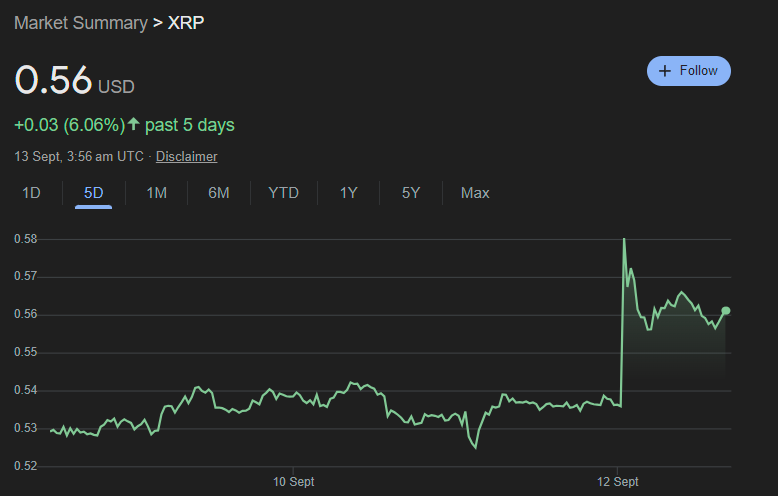 News of the XRP tie-up sent XRP's price up around 8% to as high as $0.58.