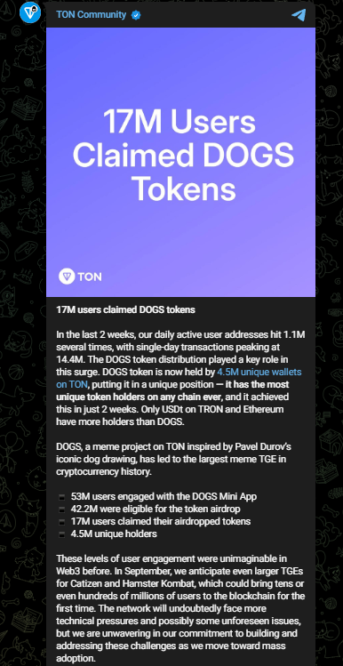 Last month, TON blockchain network experienced a significant disruption on Wednesday morning (SGT), likely due to an overwhelming influx of transactions related to the launch of a new memecoin, DOGS currently held by 4.5M unique wallets on TON.