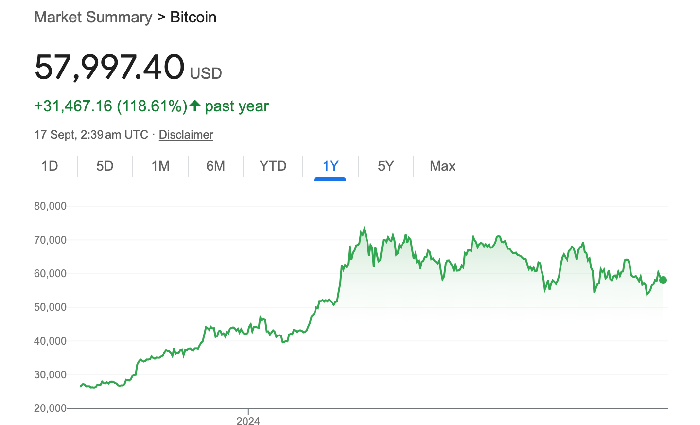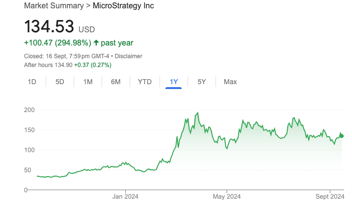 MicroStrategy's stock price is up almost 300% over the year, while Bitocin is up just shy of 120%.
