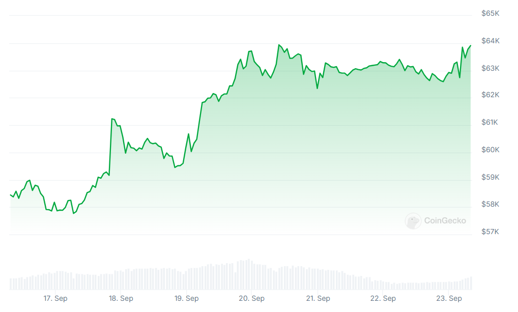 As of publication time, Bitcoin is trading at $63,772.42, per CoinMarketCap data, up 9.10% in the past week.