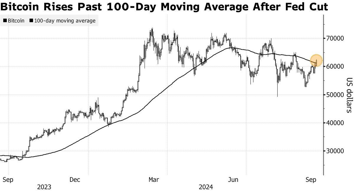 However, Bitcoin enthusiasts saw the latest 50 bps cut as a strong start and a boost to crypto's appeal, similar to stocks. The top token jumped above its 100-day trading average after the Fed's move.