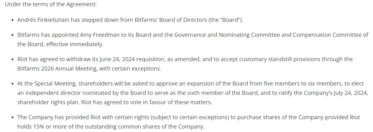 Brian Howlett, Independent Chairman of the Board, said, “We are pleased to reach this agreement with Riot, which we believe is in the best interests of all Bitfarms shareholders.”