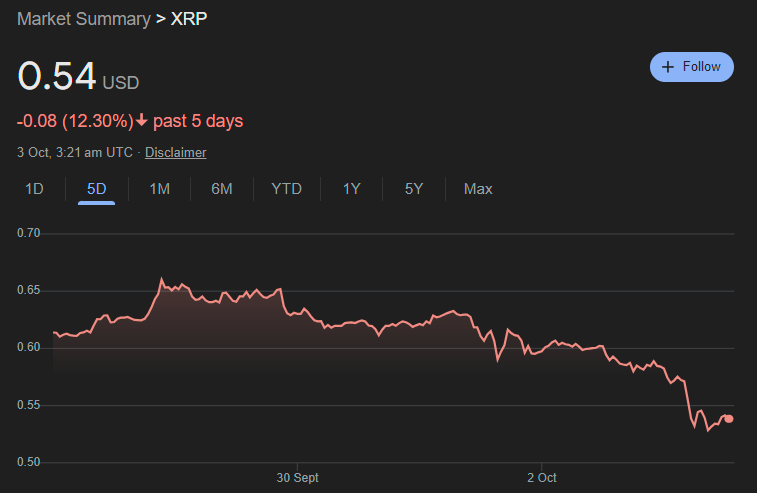 News of the SEC's appeal sent XRP's price spiralling below $0.55, after just reaching highs of $0.64 on Monday.