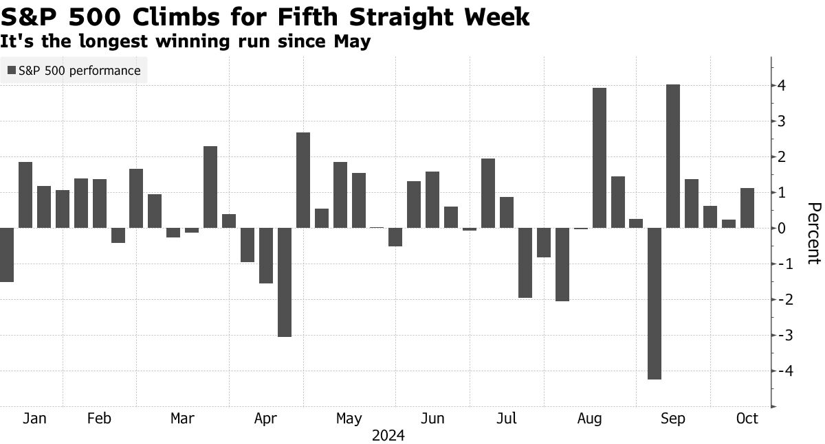 Gains for the S&P 500 continued for a fifth consecutive week, marking its longest winning streak since May, as the index advanced 0.6% on Friday.
