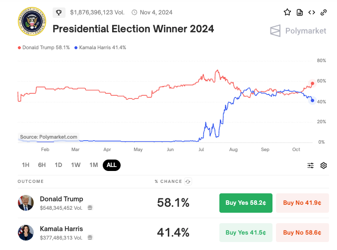 Trump now has a 16% lead in the US presidential election polls on Polymarket against Kamala Harris with 58.1% odds compared to the Democrat nominee's 41.4%.