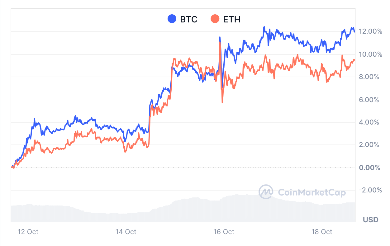Over in the markets, there's more good news. Bitcoin is up around 12% over the week while Ethereum is up almost 10%.