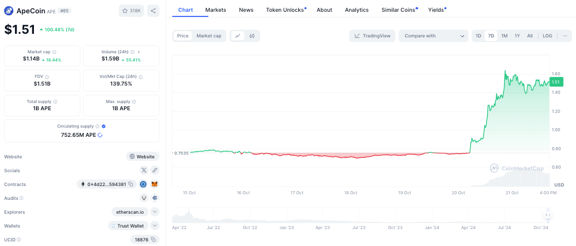 News of ApeChain's launch sent ApeCoin (APE) skyrocketing 100%. Specifically, APE will function as a gas token for transactions, driving demand and incorporating a burn mechanism.