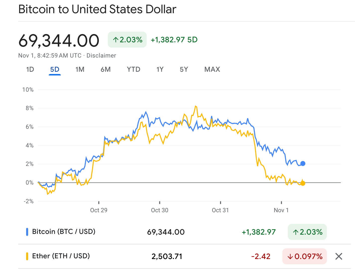 Over in the markets, as mentioned, Bitcoin has slipped slightly from its peak earlier this week. That said, it's still up over 2% this week, while Ethereum has slipped negligibly.