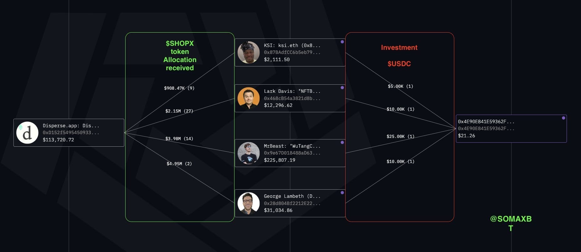 SPLYT is another project where MrBeast invested $25k USDT. He made $765k by selling his SPLYT token allocation and is still holding 177k SHOPX tokens. In this project, he shared the spotlight with KSI and Lark Davis. pic.twitter.com/hrOyYmsaBo