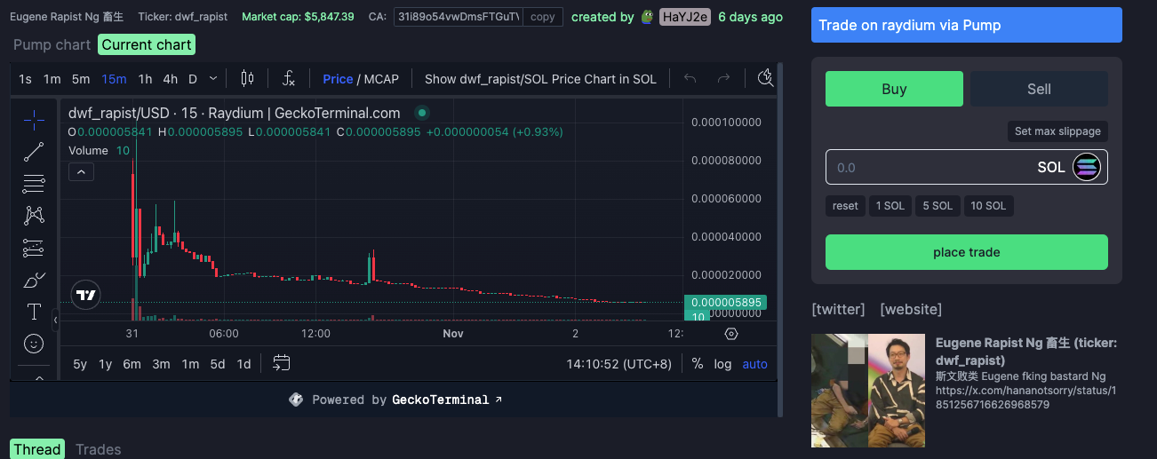 One project, Eugene Rapist Ng 畜生 (ticker: dwf_rapist), even has a dedicated X page for the project. In a pinned tweet, the project writes, "I'm a scumbag rapist, and this shall forever be immortalised."