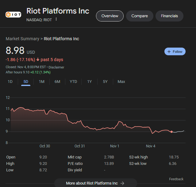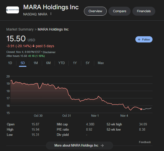 Nonetheless, both Marathon and Riot saw their stock price fall around 4% over the past 24 hours and 20% and 17% respectively over the last five days.