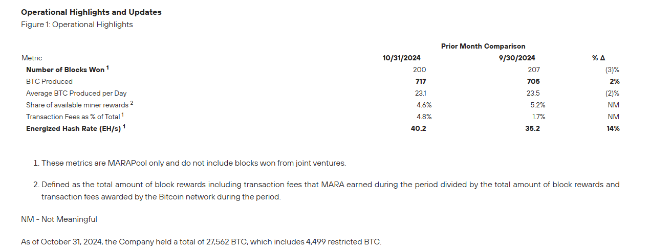 In October, Marathon Digital revealed it produced 717 Bitcoin, worth $47.7 million, according to a statement. The crypto mining giant attributed the achievement partly to its improved energized hash rate.