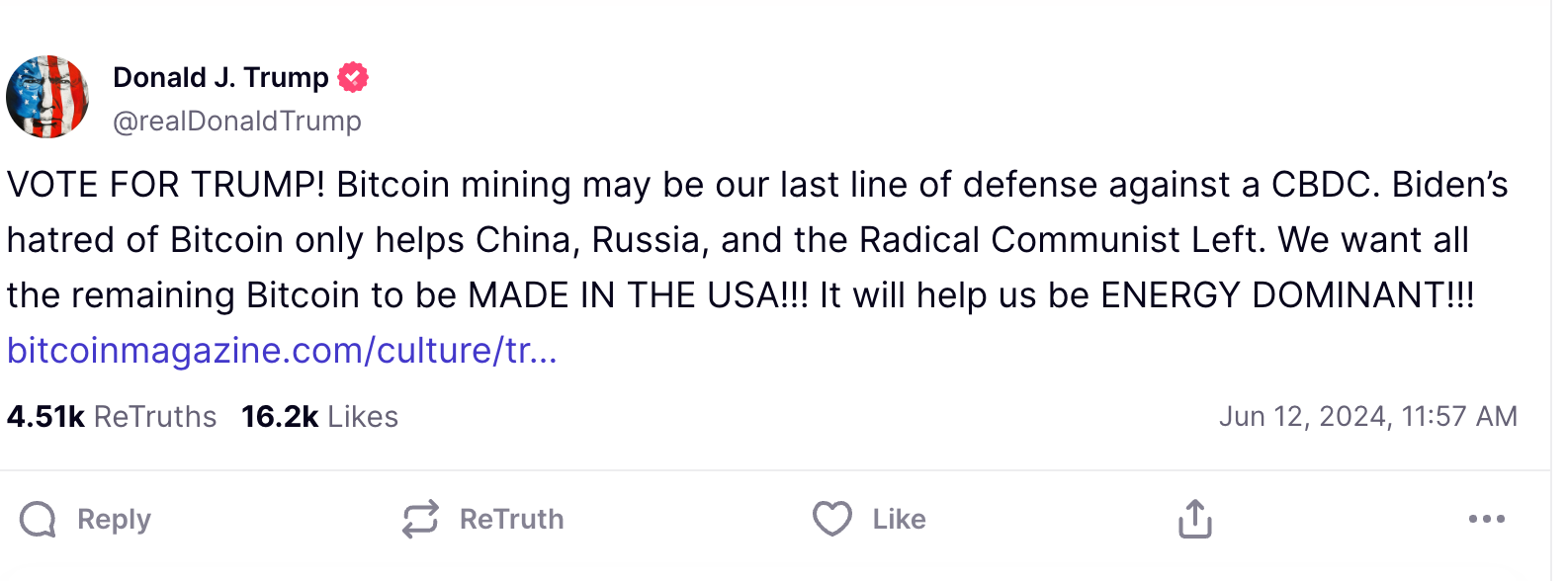 “Biden’s hatred of Bitcoin only helps China, Russia, and the Radical Communist Left. We want all the remaining Bitcoin to be MADE IN THE USA!!! It will help us be ENERGY DOMINANT!!!” Trump posted.
