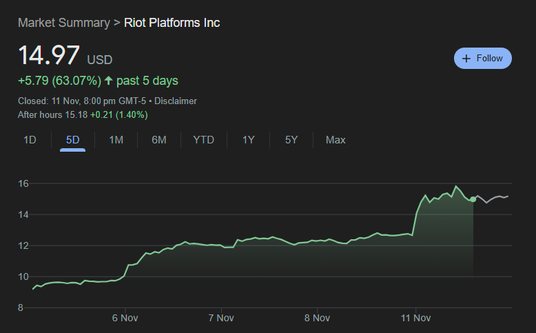 Crypto miners Riot Platforms and Marathon Digital have also enjoyed significant gains over the same period, rising more than 63% and 56% respectively.