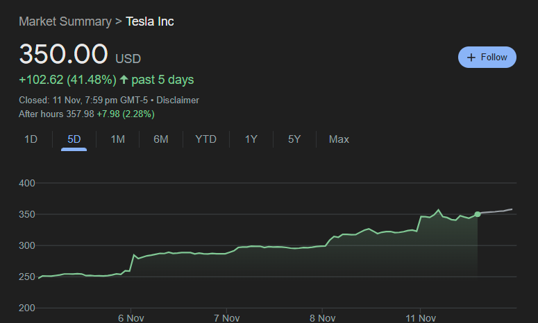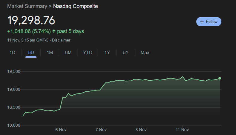 The S&P 500 has performed even worse with a gain of just 4.9% over the week, despite Trump's BFF, Elon Musk, witnessing Tesla surging more than 41%.