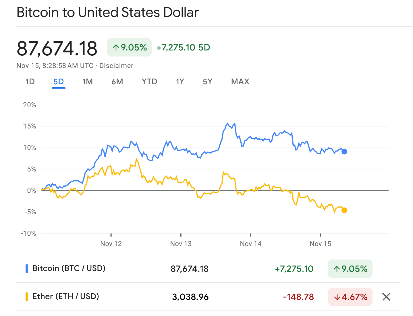 Over in the markets, Bitcoin has had a much better week than Ethereum. Up over 9% this week, BTC has beyond outperformed ETH, which has fallen more than 4.6%.