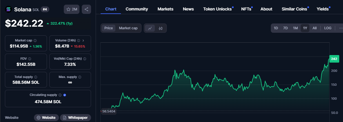 Although SOL is still short of its all-time high of $260, which it achieved in 2021, its current price of $242 marks a 322.50% increase over one year.