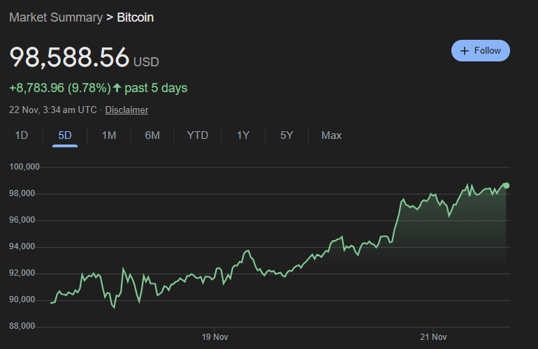 Meanwhile, at $98,588.56, Bitcoin is edging ever closer to the elusive $100,000 mark.