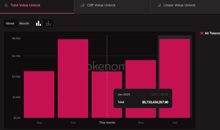 Over $5.7 billion worth of tokens are set to unlock in January 2025, according to Tokenomist, which could lead to shifts in liquidity and increased price volatility.