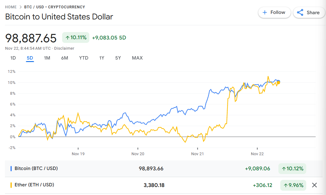 The narrative shifts significantly in the innovative realm of cryptocurrency. Despite Bitcoin's retreat from Wednesday's record peak, it has remained nearly 30% higher since the presidential election.
