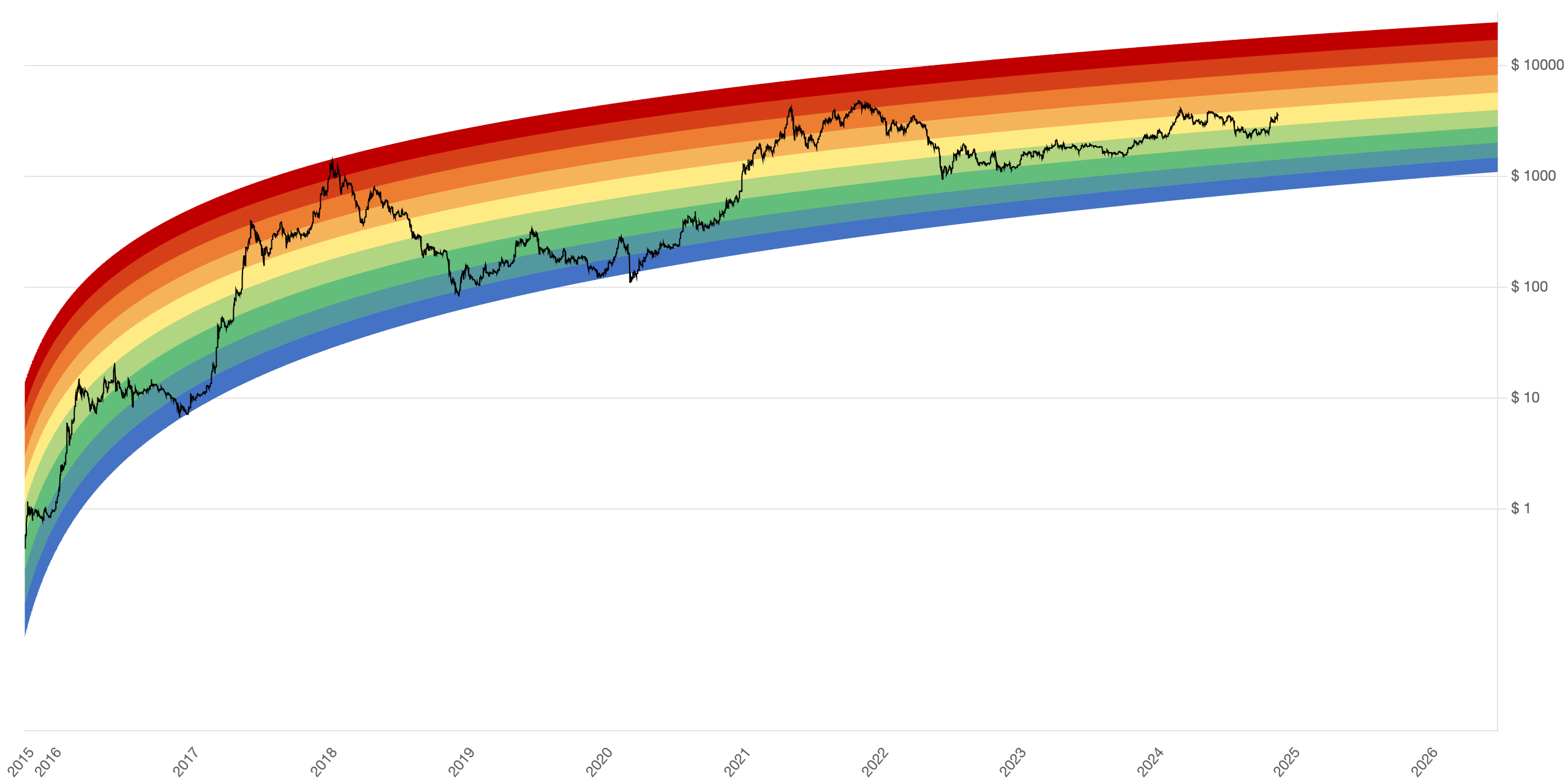 The Ethereum Rainbow Chart, which tracks historical price data across various zones, currently places Ethereum in the “Steady” (yellow) zone, suggesting moderate growth potential. For ETH to transition into higher valuation zones, such as “HODL!” (orange) or “Maximum Bubble Territory” (red), it would need to breach the $4,000 mark convincingly.