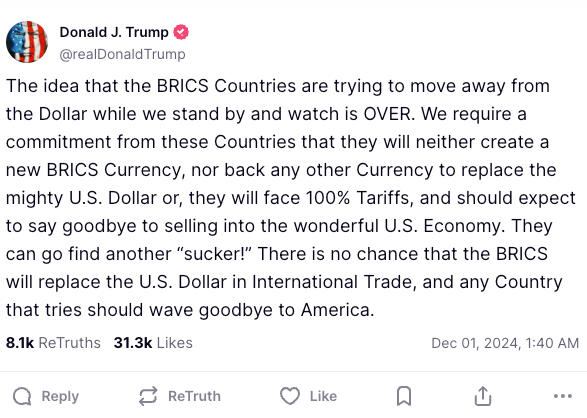 Trump's latest salvo to the BRICS Group is a clear example. The President-elect has warned of 100% trade tariffs on the BRICS nations if the group looks ade-dollarisationon with a common trade currency framework or an alternative forex method other than the greenback.