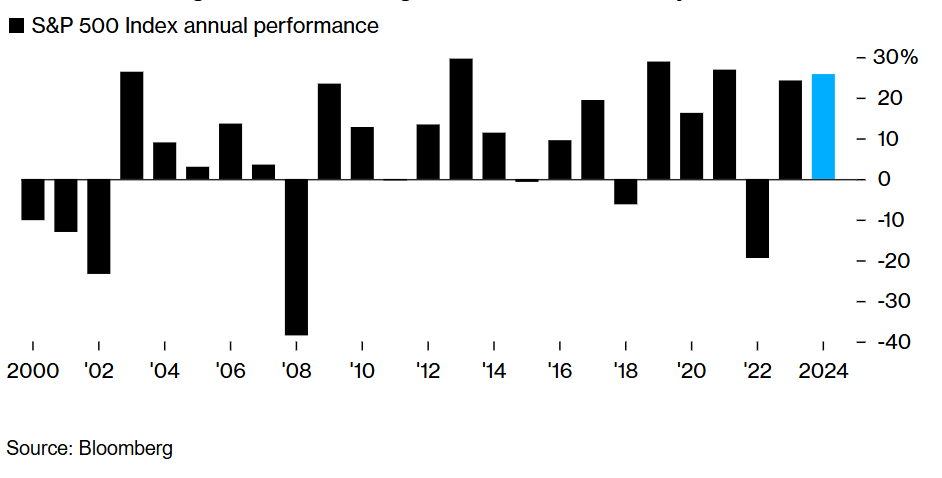 For stocks, 2024 is set to enter the Bulls' Hall of Fame, with the S&P 500 index gains ranking among the best in this century.