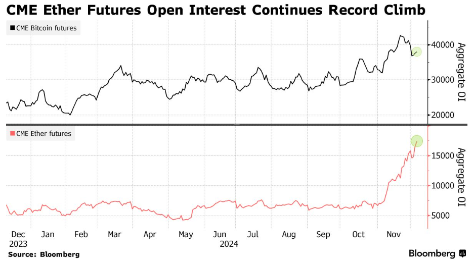 Open interest in futures contracts for Ether has soared to record levels on CME Group Inc.'s derivatives platform, surpassing the increase in Bitcoin futures contracts by a wide margin, which indicates that investors expect further gains.