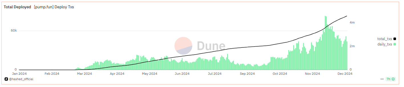Dune data shows that over 4 million memecoins were deployed via Pump.fun earlier this month. The platform also hit an all-time high of over $93 million in monthly revenue last month.