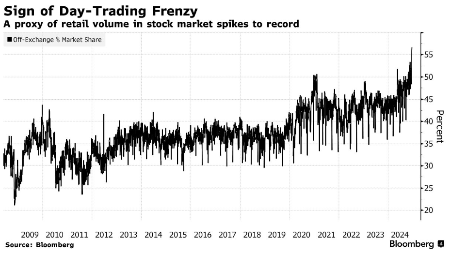 As a stand-in, the number of trades conducted through non-exchange venues—those operated by equity wholesalers catering to clients like Robinhood Markets—has surged to over 50% and just reached an all-time high.